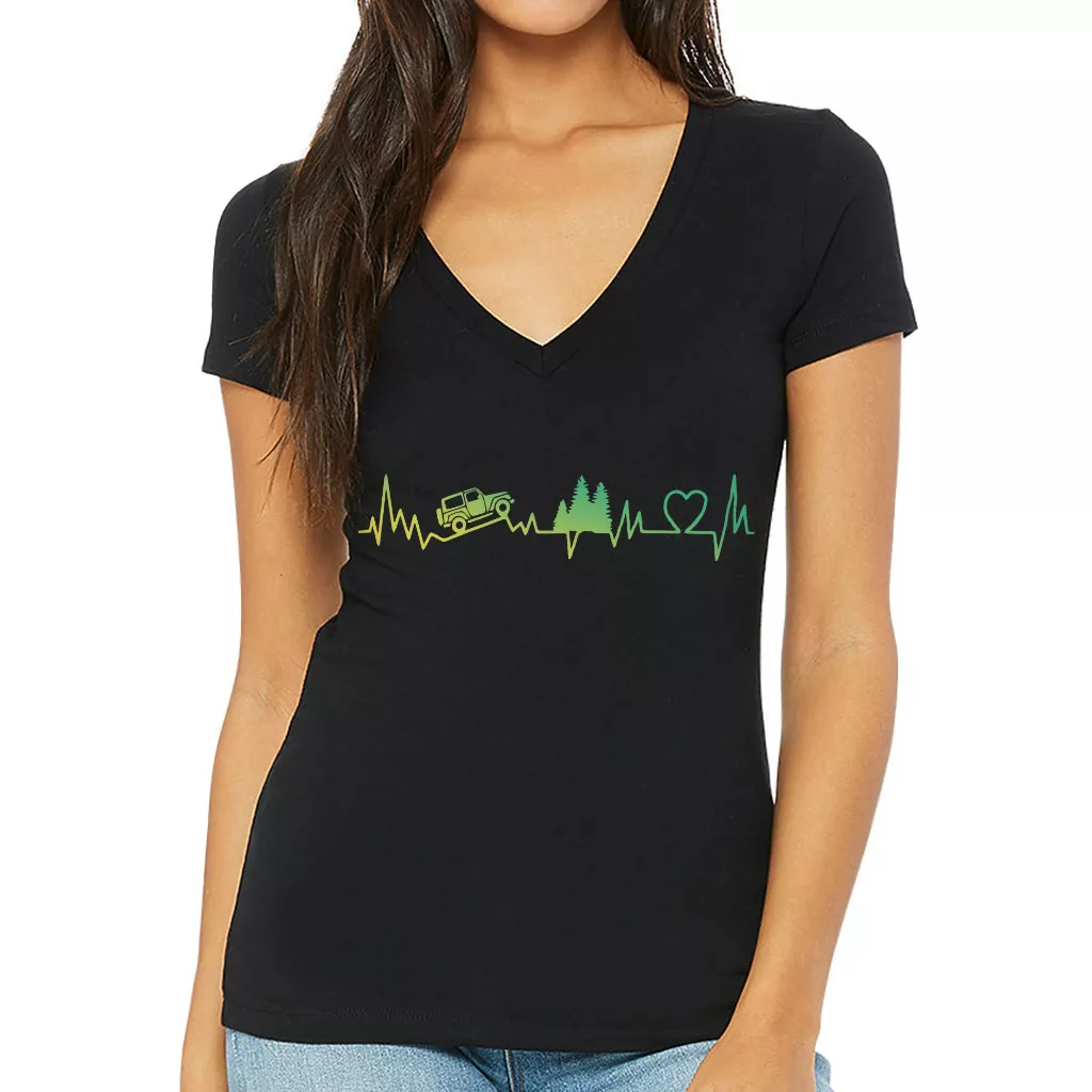 The fabric of our shirt is super soft, lightweight, breathable, and cozy. The Off Road Heartbeat V-Neck T-Shirt features a modern feminine fit, deep V-neck, short sleeves and superior Airlume combed and ring-spun cotton.